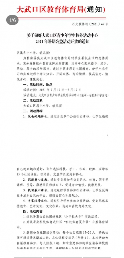 现将《关于做好大武口区青少年学生校外活动中心2021年暑期公益活动开放的通知》和活动报名表转发给大家,请大家按照文件要求组织本班学生报名,报名表于7月6日下午6:00以前发至班主任群。